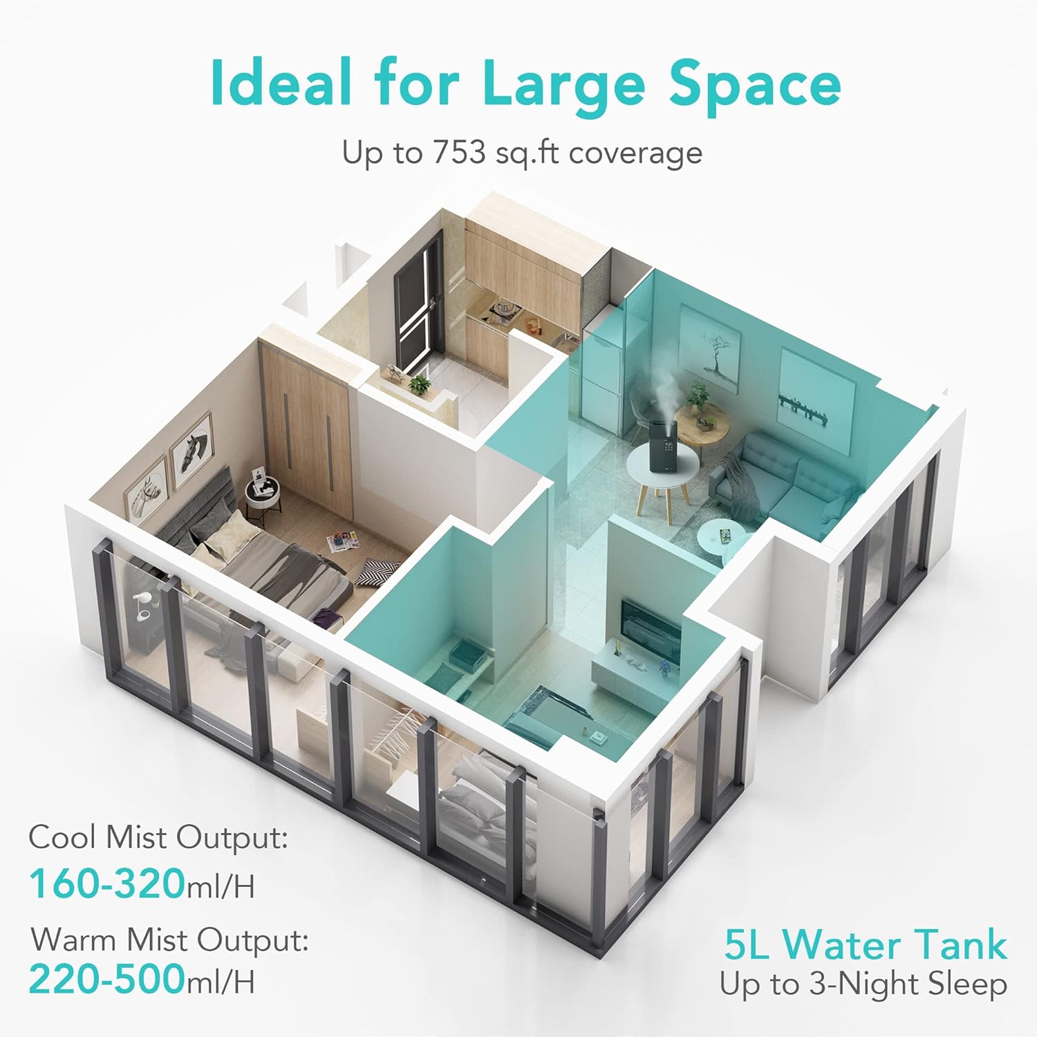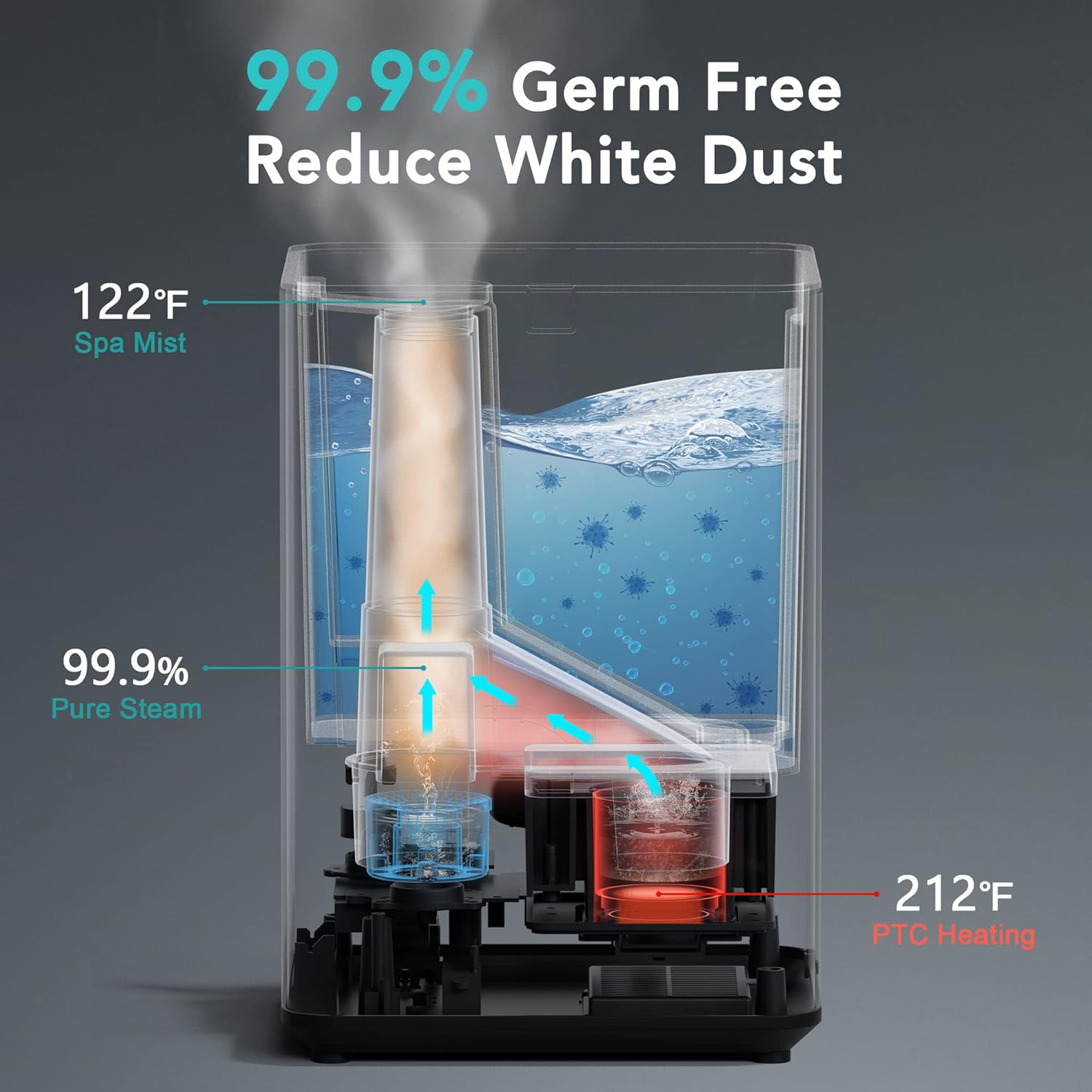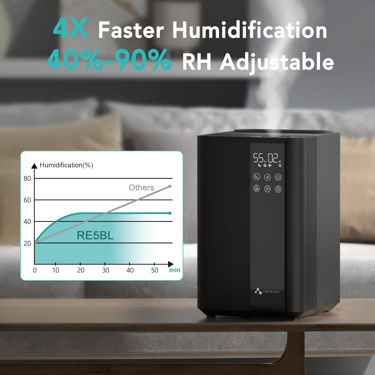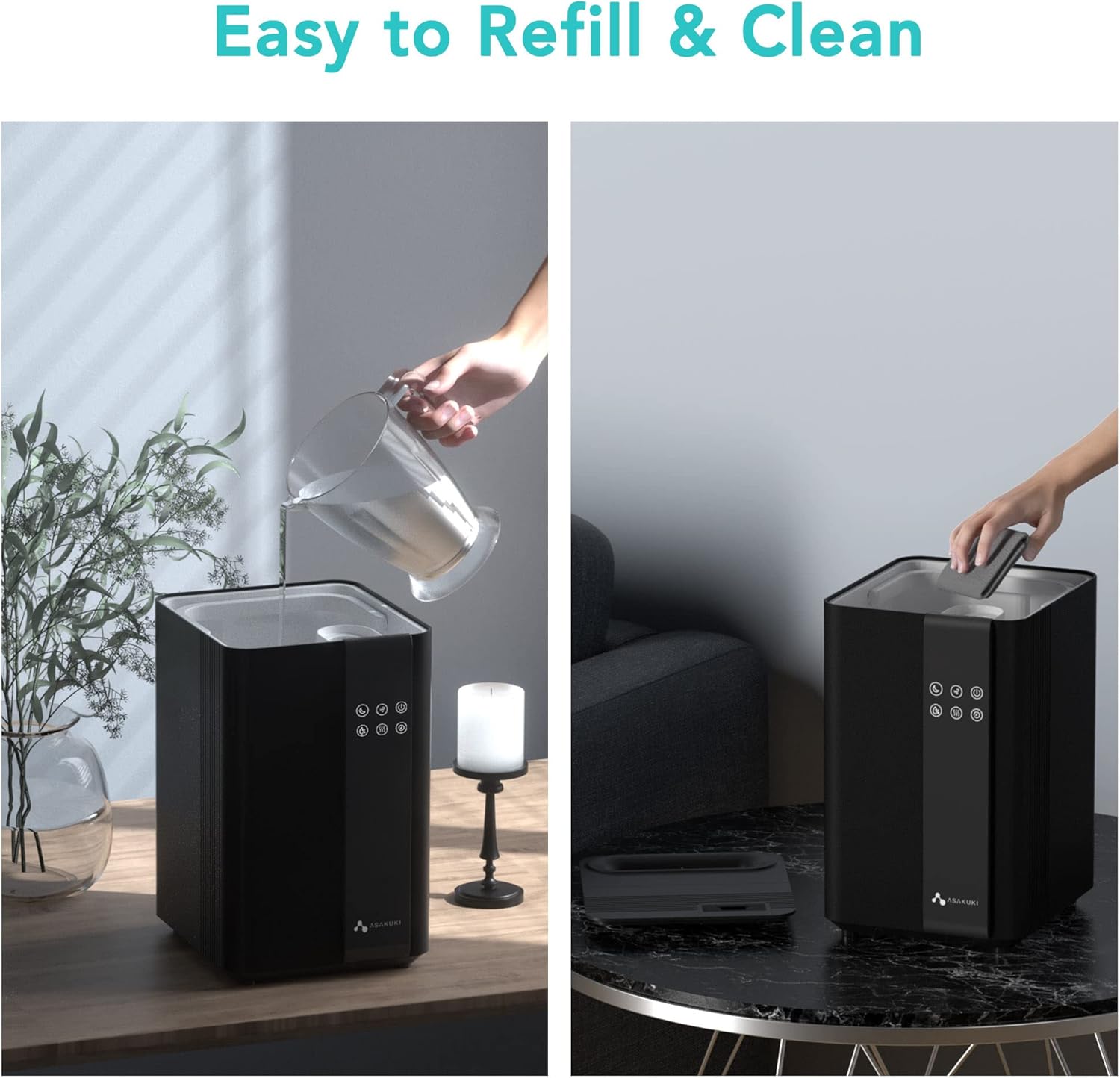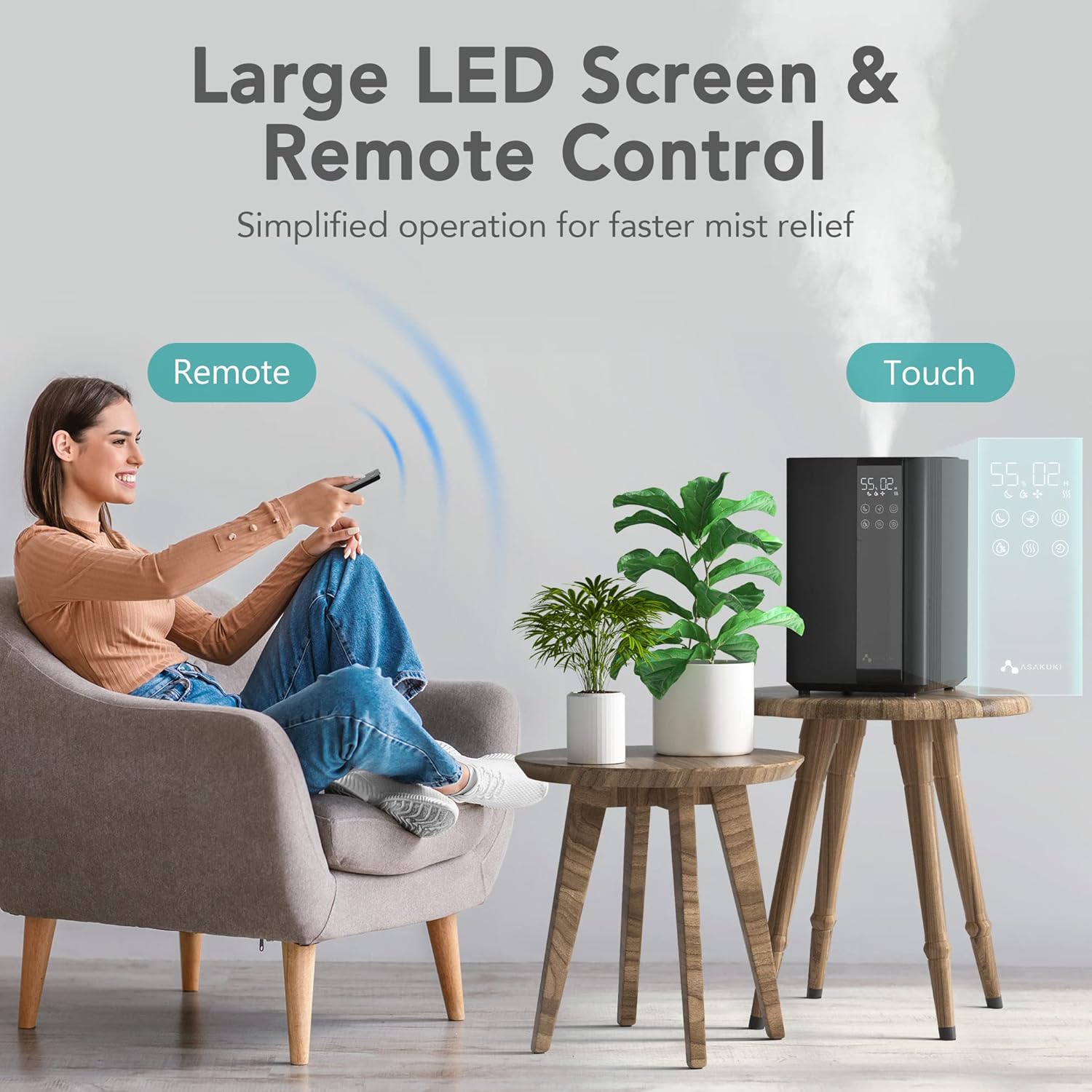 IDEAL LARGE ROOM/BEDROOM HUMIDIFIER: This ultrasonic humidifier comes with auto humidity control, 4L larger water tank, 40H longer runtime, faster mist relief, easier remote/touch operation, and one-step refill. All you need to do is set the humidifier, leave it, and enjoy a healthier life.