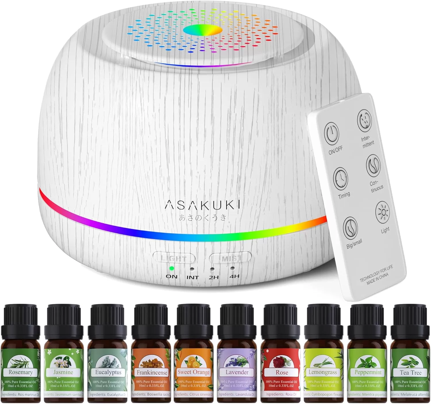 ASAKUKI Premium Essential Oil Diffuser with 10 Oil Set &Remote Control, 5 in 1 Ultrasonic Aromatherapy Fragrant Oil Humidifier Vaporizer, Timer and Auto-Off Safety Switch-White