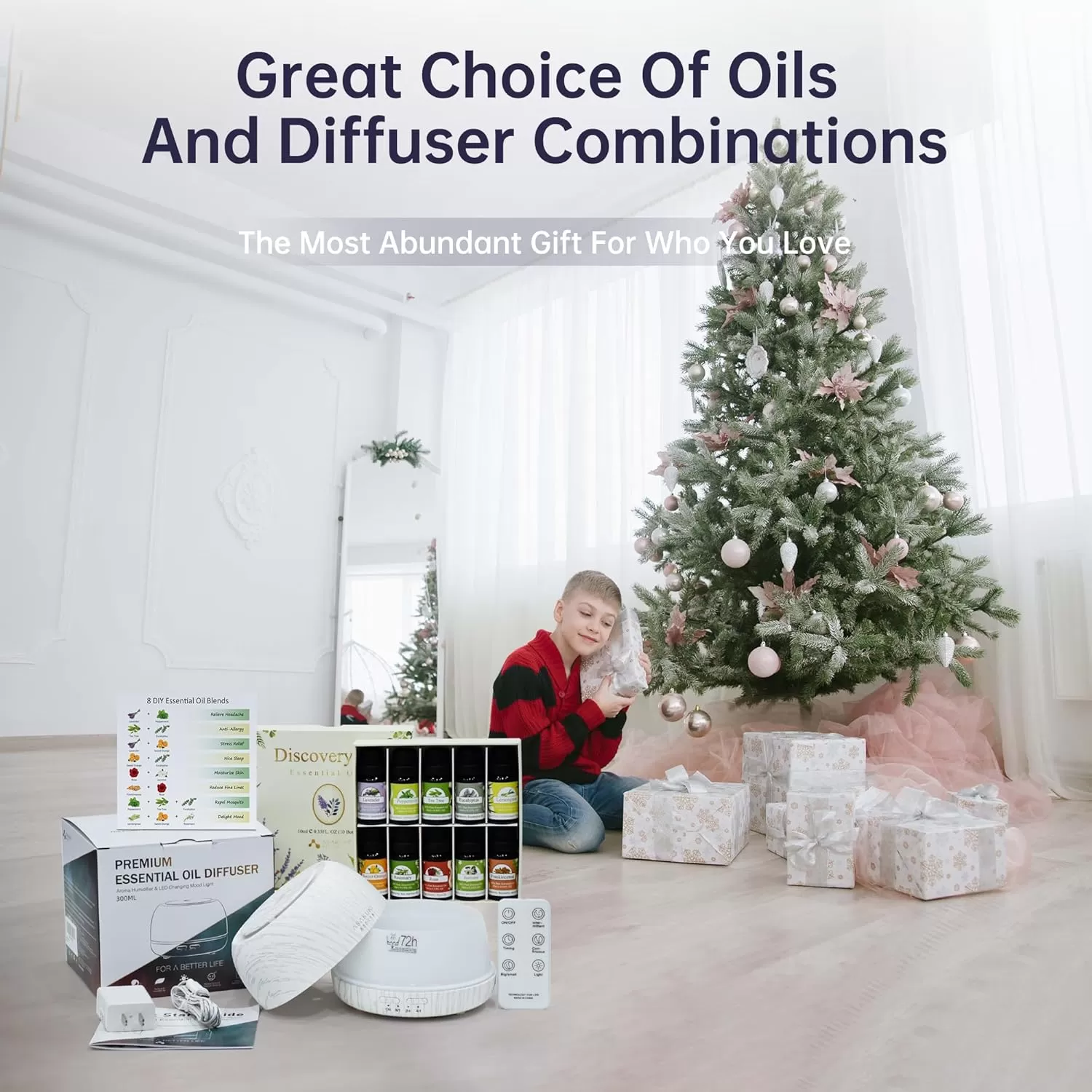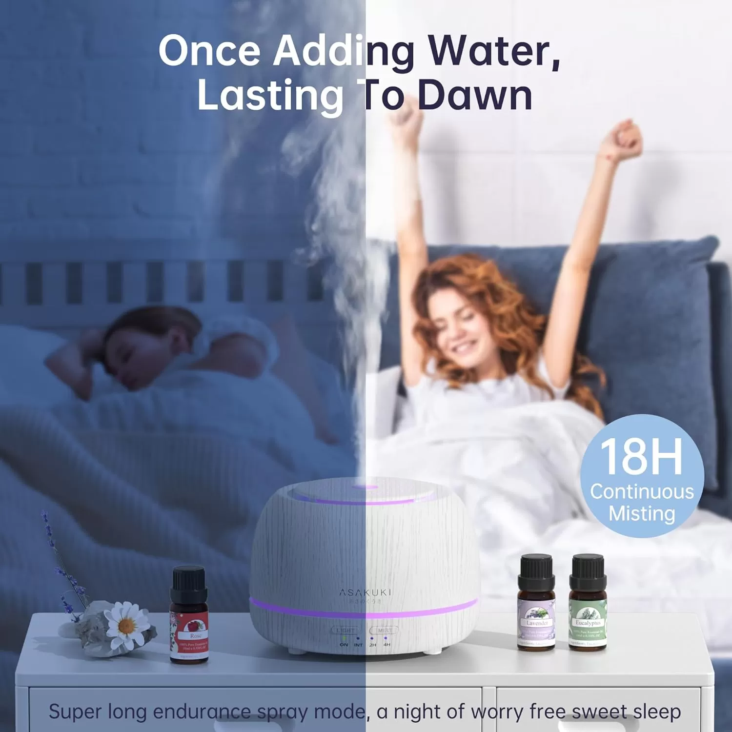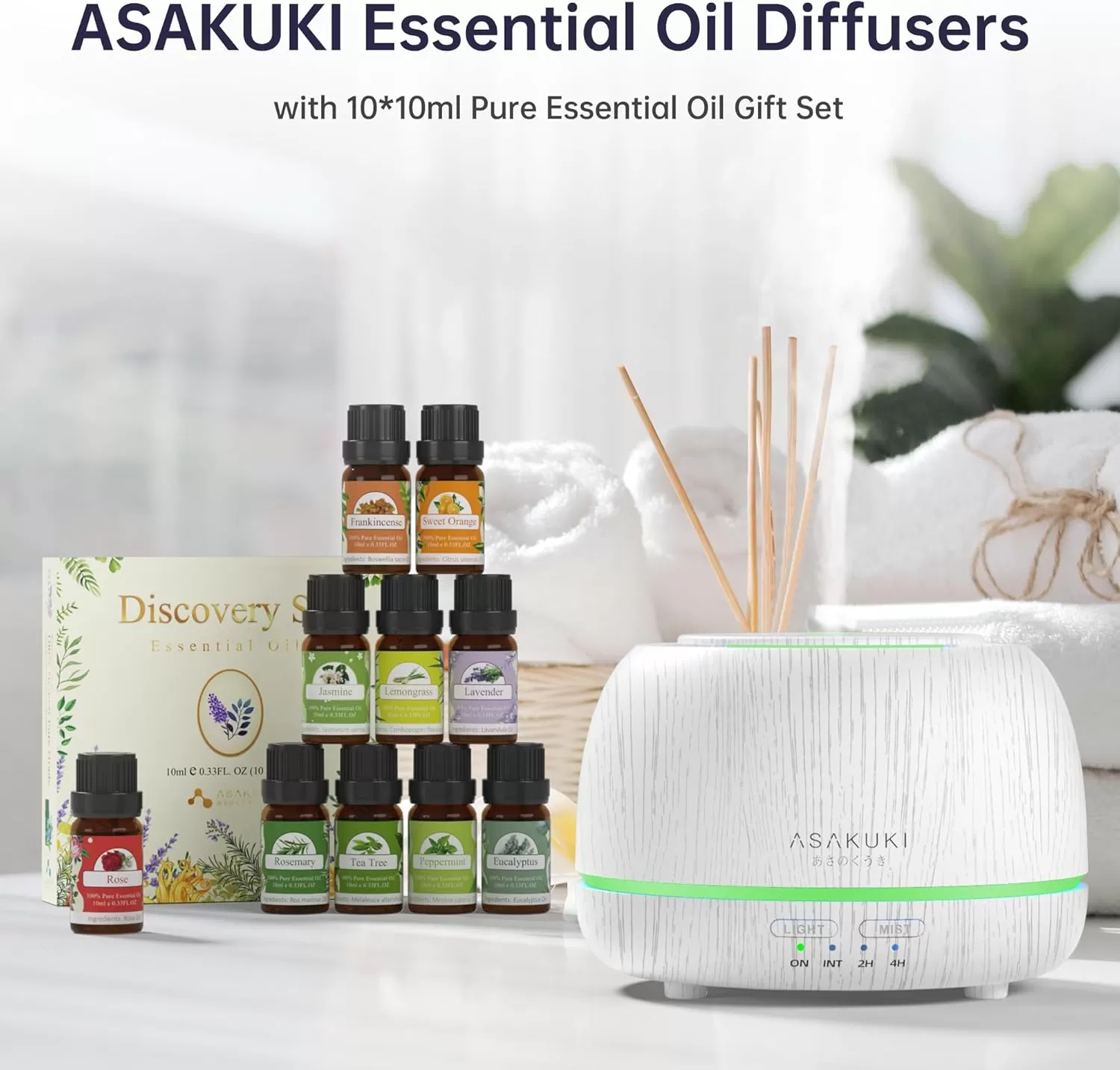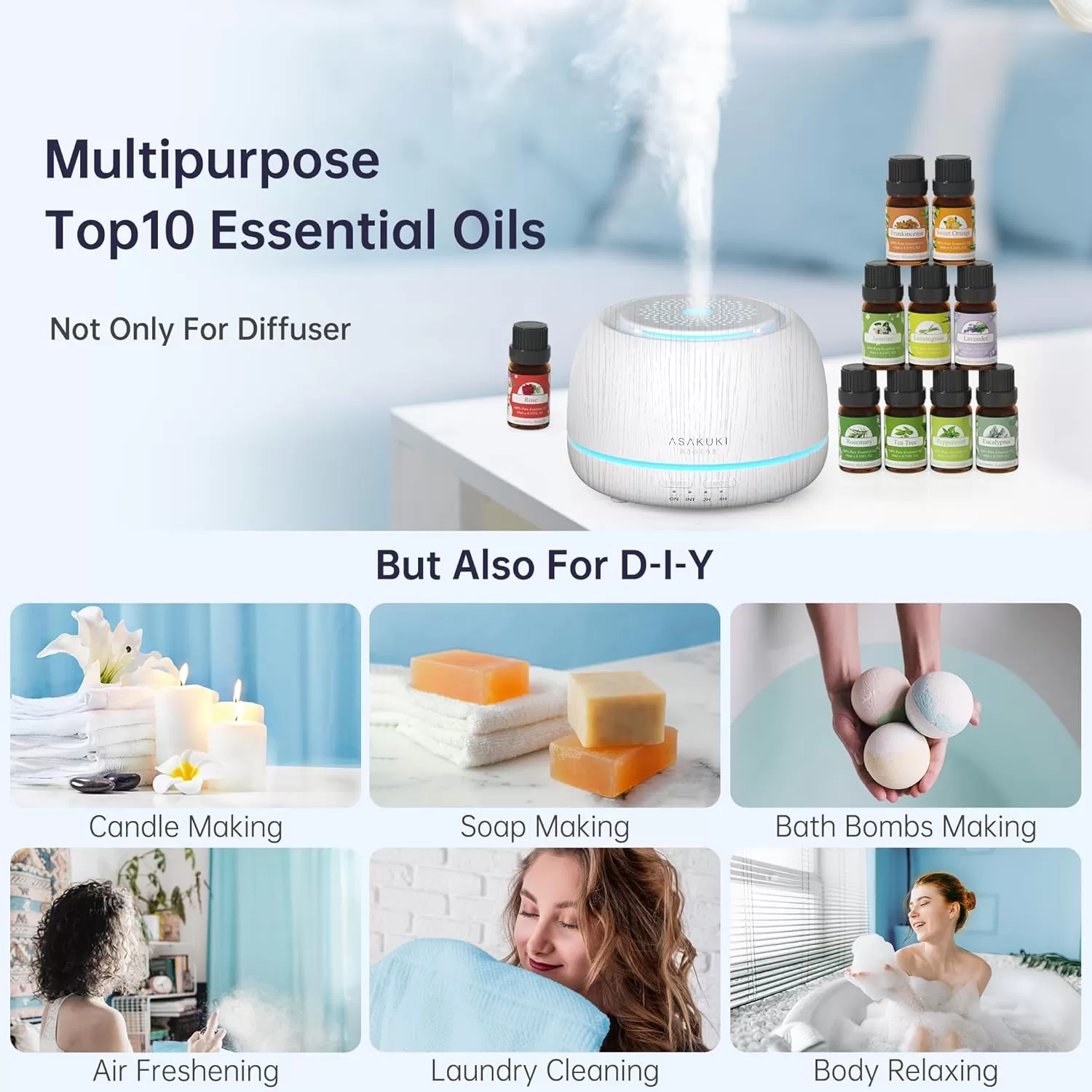 AROMA DIFFUSERS WITH 10*10ML ESSENTIAL OIL GIFT SET: The 300ml water tank supports producing mist for up to 18 hours while saving space. Along with the 100% plant-grade organic oils: Lavender, Peppermint, Tea Tree, Eucalyptus, Lemongrass, Sweet 0range, Rosemary, Rose, Jasmine, and Frankincense. Just one order, you will get the most popular 10 flavors and live in a good mood.