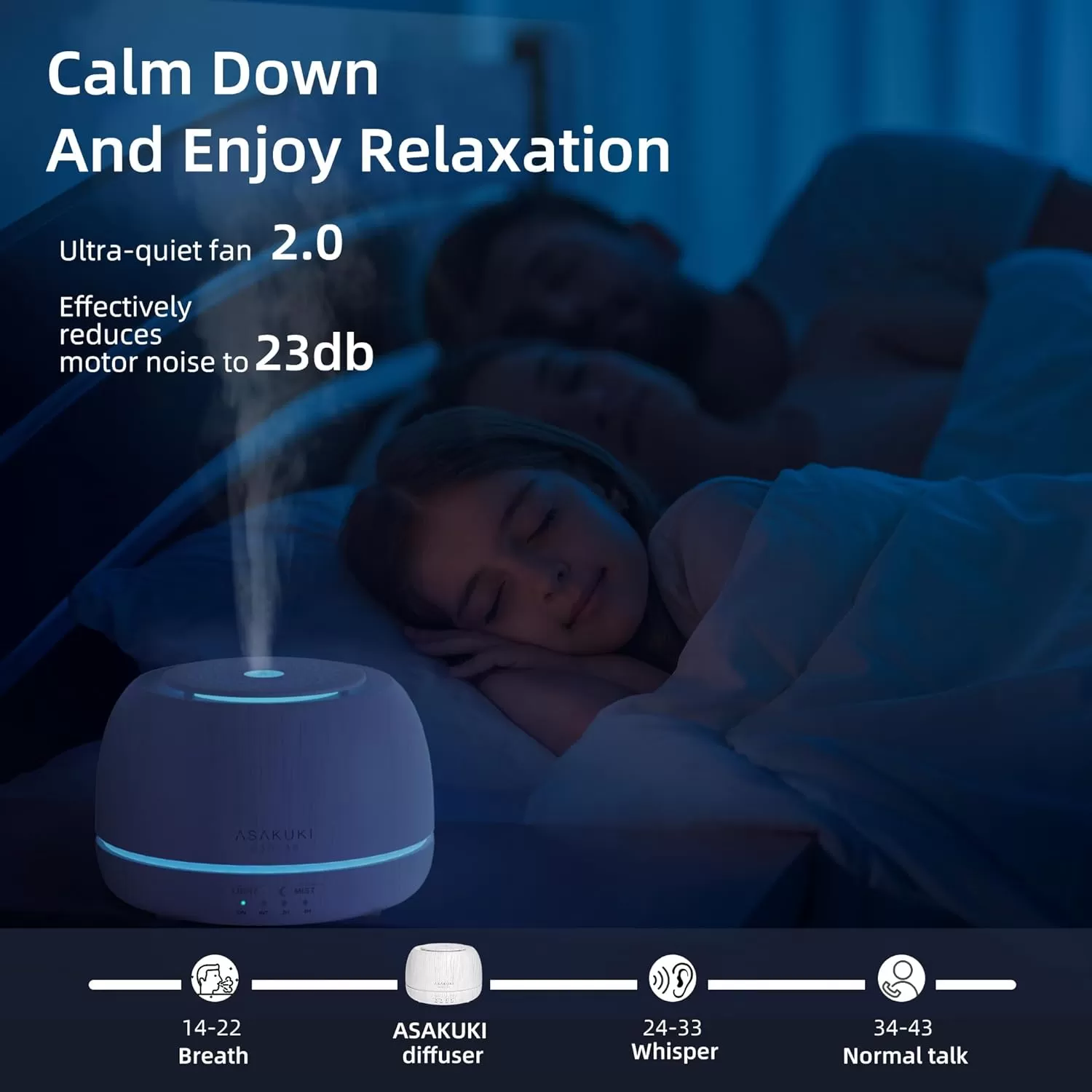 SUPER QUIET FAN & BPA-FREE MATERIAL: The noise level below 23 dB means this diffuser works more quietly than breathing; Safe bpa-free material water tank; up to 18-hour misting at a time; A safety auto-switch to prevent the diffuser from overheating when water runs out. Which provide you with a perfect sleeping environment.